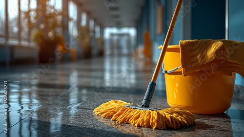 Yellow mop and bucket on a shiny floor in a brightly lit hallway, suggesting cleaning or maintenance in progress.