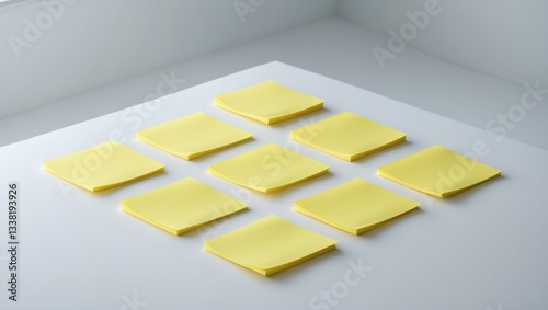 Yellow note sheets arranged on a white surface, isolated.