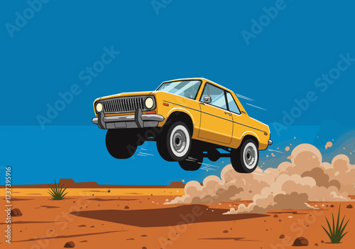 Yellow Off-Road Vehicle Jumping in Desert Landscape Illustration.