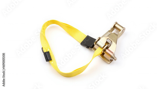 Yellow ratchet strap with metal buckle for secure cargo tie-down