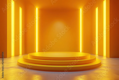 Yellow room with round table and two yellow lights.