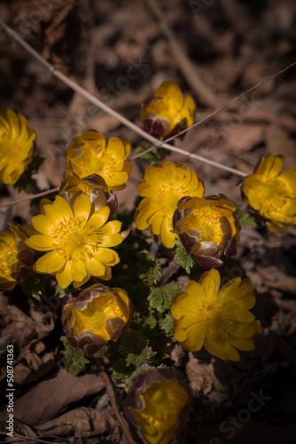 Yellow snowdrops among dried leaves in the forest
