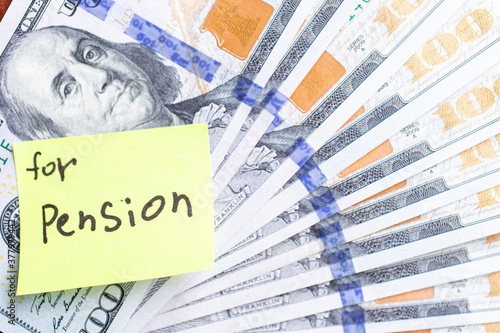Yellow stick note on an USD 100 dollars money fan background. The inscription "For pension" on a yellow memory sticky note. Close up