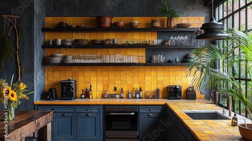 Yellow tiled kitchen with dark blue cabinets, open shelving, and industrial window.