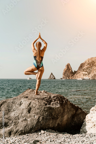 Yoga on the beach. A happy woman meditating in a yoga pose on the beach, surrounded by the ocean and rock mountains, promoting a healthy lifestyle outdoors in nature, and inspiring fitness concept.