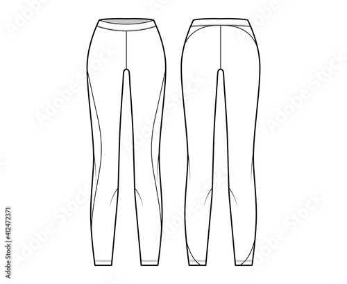 Yoga pants Leggings technical fashion illustration with low waist, rise, full length. Flat sport training, bottom knit trousers apparel template front, back, white color. Women men unisex CAD mockup