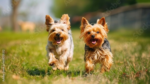 Yorkshire terriers happily running on the grass