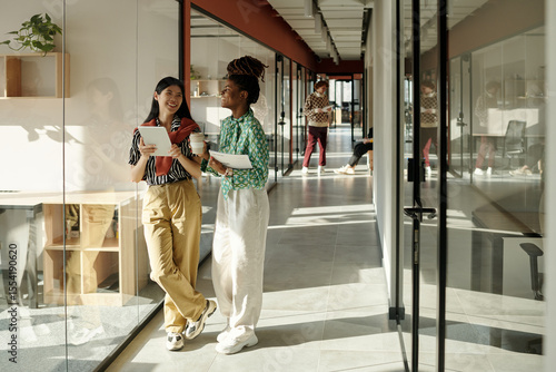 Young adult Asian woman and Black woman standing in modern coworking space holding digital tablet, smiling and talking near glass office wall
