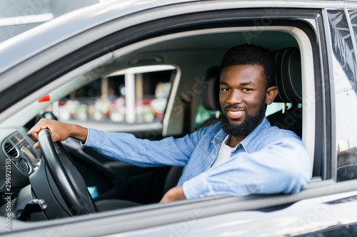 Young affluent successful african man driving his new expensive car