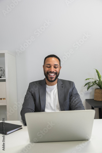 Young african american businessman smiling while working using his laptop at the office. Good news conference call with colleagues.