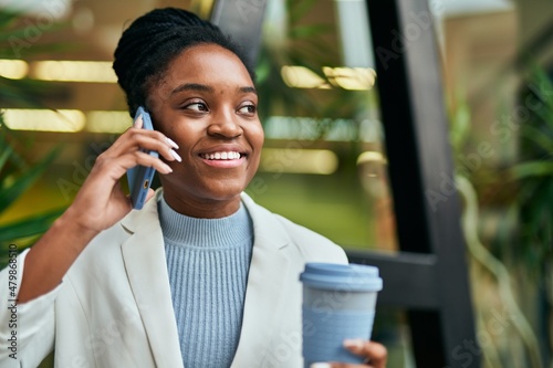 Young african american businesswoman talking on the smartphone and drinking coffee at the city.