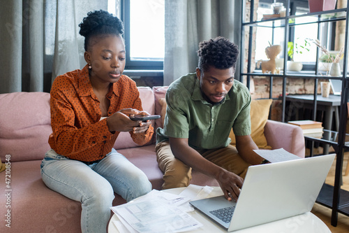Young African American couple in casual outfits using modern devices while preparing tax papers