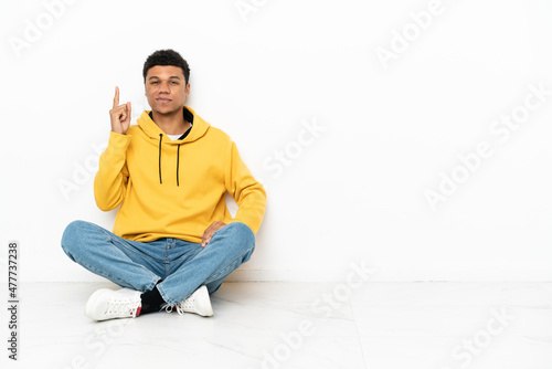 Young African American man sitting on the floor isolated on white background pointing with the index finger a great idea