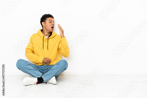Young African American man sitting on the floor isolated on white background yawning and covering wide open mouth with hand