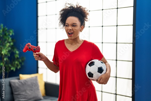 Young african american woman playing football video game angry and mad screaming frustrated and furious, shouting with anger. rage and aggressive concept.