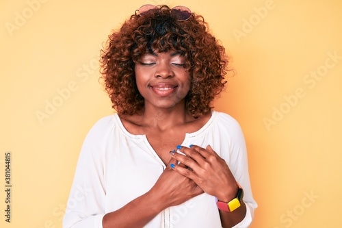 Young african american woman wearing casual clothes smiling with hands on chest with closed eyes and grateful gesture on face. health concept.