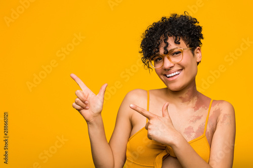 Young african american woman with skin birth mark pointing with forefingers to a copy space, expressing excitement and desire.