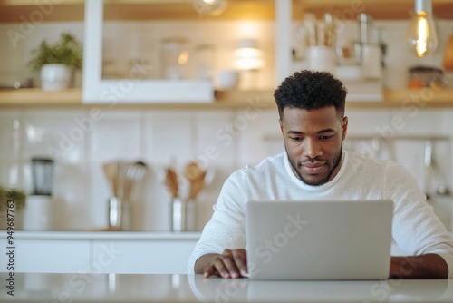 Young African man in a light grey shirt working on a laptop in a minimalist kitchen space, deeply focused on his task, blending work and home life in a modern and clean environment
