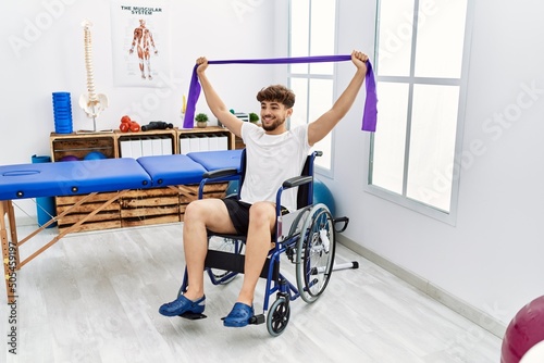 Young arab man patient sitting on wheelchair doing rehab using elastic band at clinic