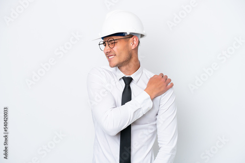 Young architect caucasian man with helmet and holding blueprints isolated on white background suffering from pain in shoulder for having made an effort