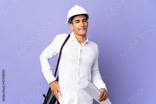 Young architect man isolated on background suffering from backache for having made an effort