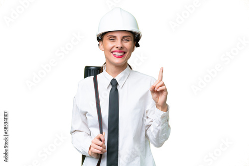 Young architect woman with helmet and holding blueprints over isolated background pointing up a great idea