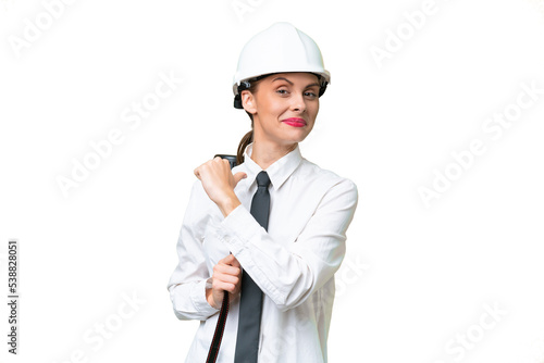 Young architect woman with helmet and holding blueprints over isolated background proud and self-satisfied