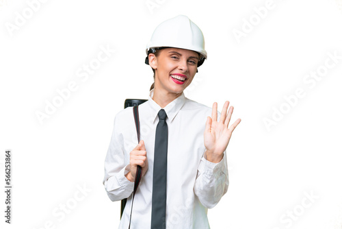 Young architect woman with helmet and holding blueprints over isolated background saluting with hand with happy expression