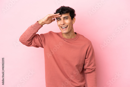 Young Argentinian man isolated on pink background looking far away with hand to look something