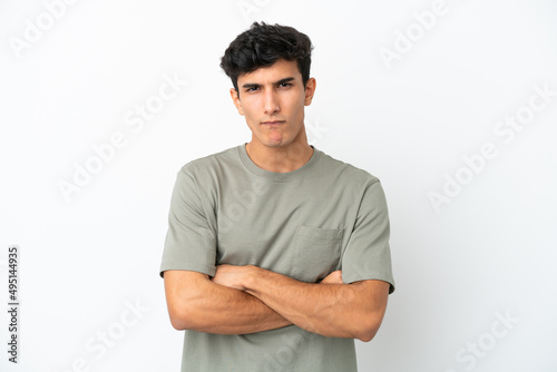 Young Argentinian man isolated on white background feeling upset