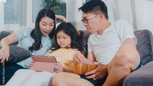 Young Asian family and daughter happy using tablet at home. Japanese mother, father relax with little girl watching movie lying on sofa in living room. Funny parent and lovely child are having fun.