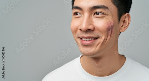 Young Asian male with facial scar smiling against gray background