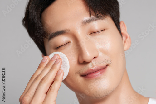 Young Asian man Cleansing Face with Cotton Pad Skincare Routine