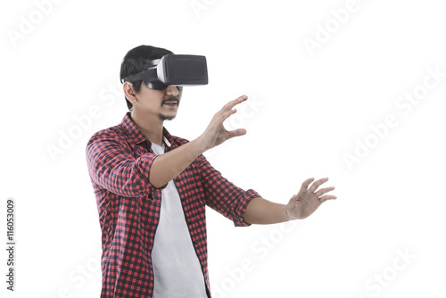 Young asian man experiencing virtual reality through a VR headset