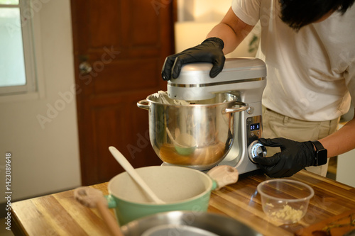 Young asian man preparing whipped cream with a stand mixer in home kitchen
