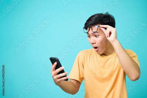 Young asian man with surprised facial expression hold smartphone in his hands.