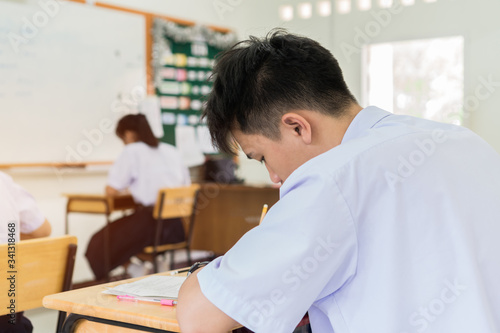 young asian student taking test or final exam, notes information in paper book, concentration of serious in learning at high school classroom with group friends with Thai white shirt uniform