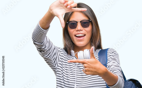 Young asian student woman wearing headphones and backpack over isolated background smiling making frame with hands and fingers with happy face. Creativity and photography concept.