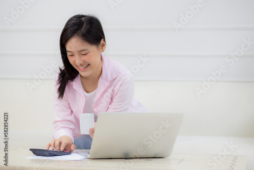 Young asian woman calculating finance household with calculator on desk at home, girl checking bill for saving and planning expenses, debt and loan, tax and accounting, business and financial concept.