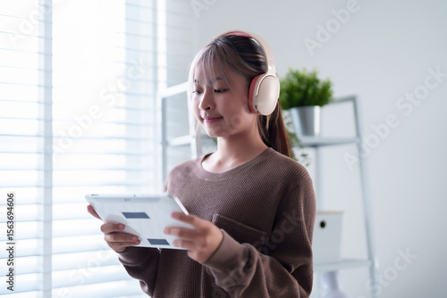 Young Asian woman enjoys tablet with headphones at home