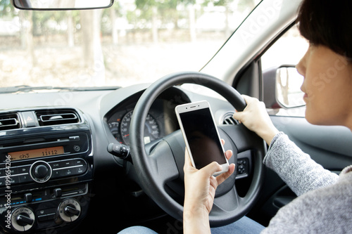 Young asian woman in casual wear driving a car and using smartphone. Back view.