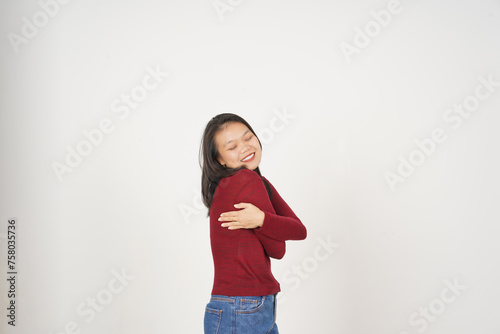 Young Asian woman in Red t-shirt Hug herself, Self love concept isolated on white background