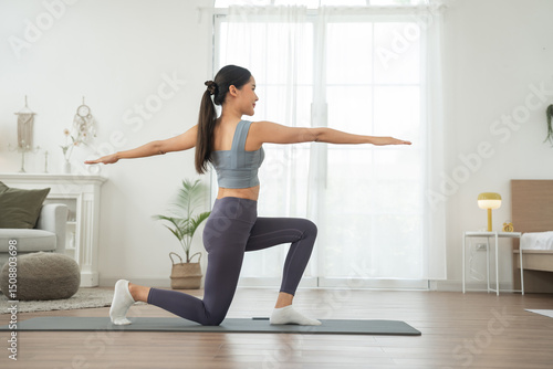 Young Asian woman in sportswear doing yoga in her home or house for health, sports and wellness, Enjoying Domestic Fitness Training And Healthy Lifestyle, Dressed In Stylish Sportswear And Smiling