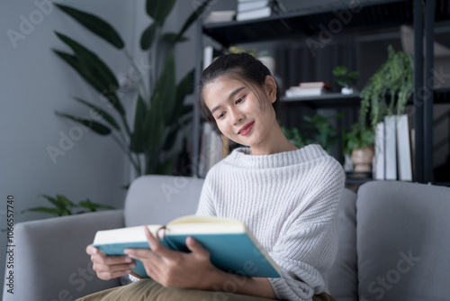 Young asian woman reading book and listening to music at home Wellness rest and relaxation hobby
