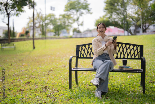 Young Asian woman sitting on a park bench, smiling and casually dressed, holding smartphone and wearing headphones while enjoying leisure time outdoors with books and a coffee cup beside her