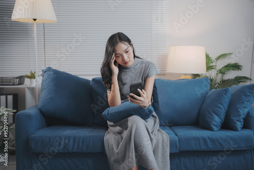 Young asian woman sitting on a sofa is feeling stressed while using a smartphone at home