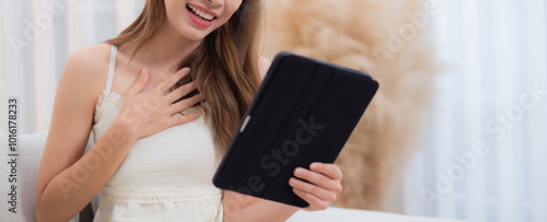 Young asian woman sitting on sofa using digital tablet computer for video call in living room at home, female using social media on tablet for chat online and conversation distant, lifestyle concept.