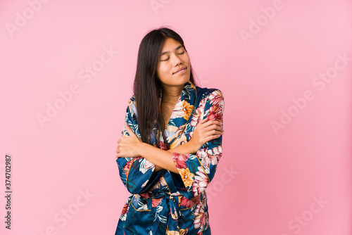 Young asian woman wearing a kimono pajamas hugs, smiling carefree and happy.