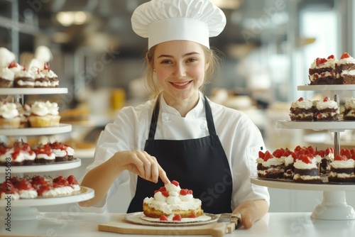 Young baker decorating a cake with fresh strawberries in a bright bakery display filled with pastry delights