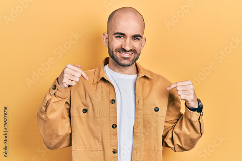 Young bald man wearing casual clothes looking confident with smile on face, pointing oneself with fingers proud and happy.